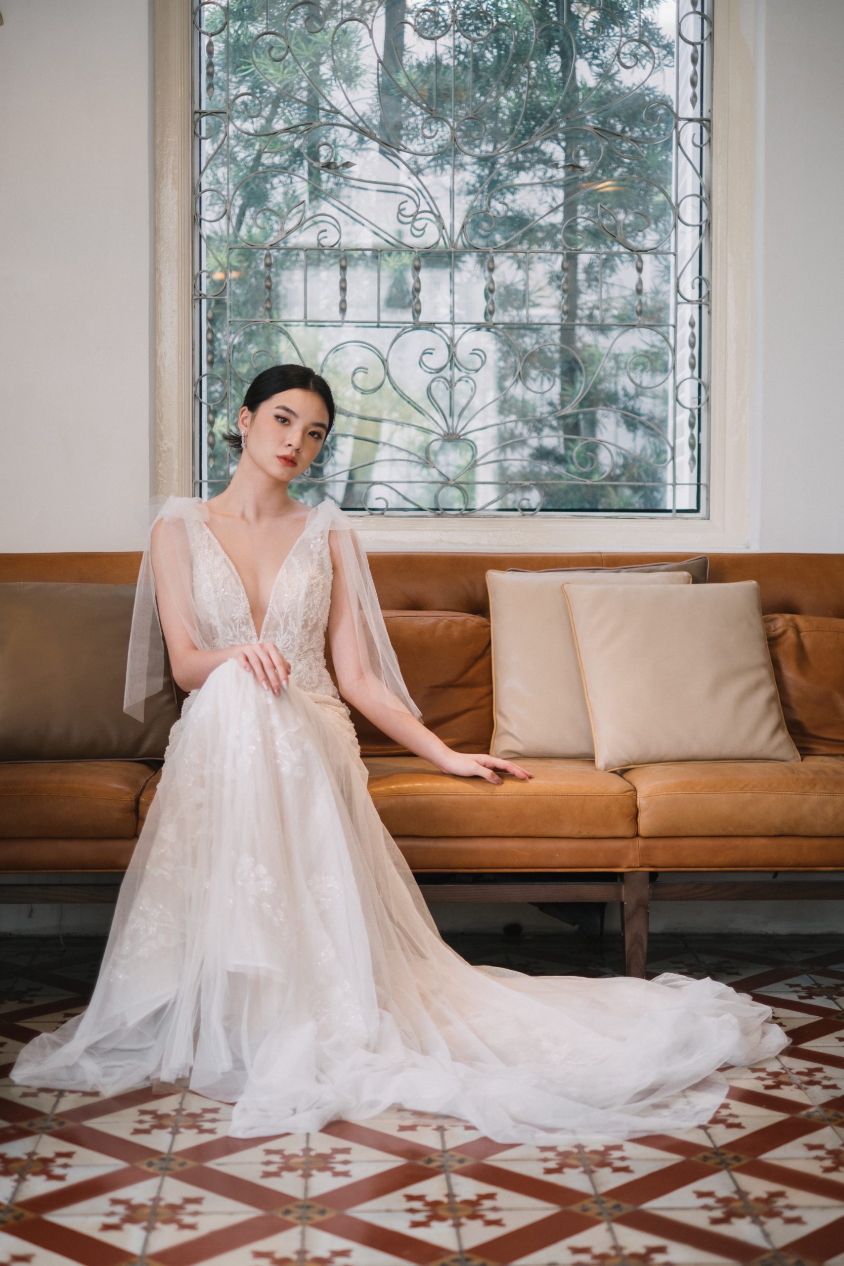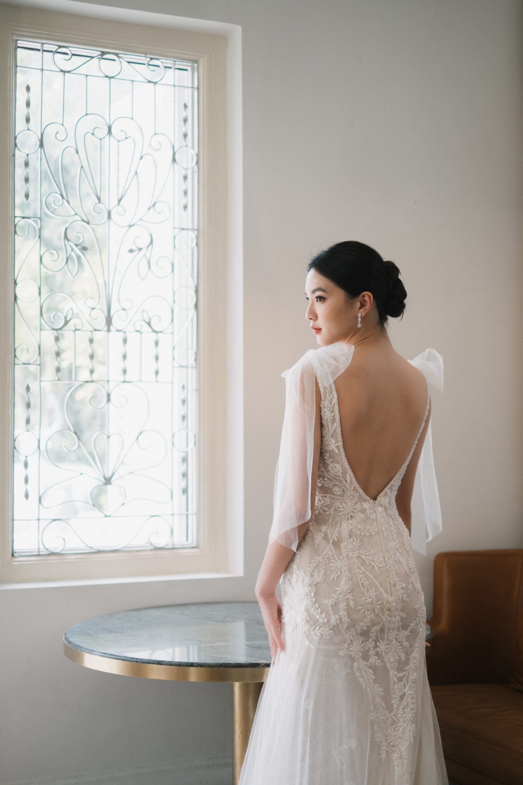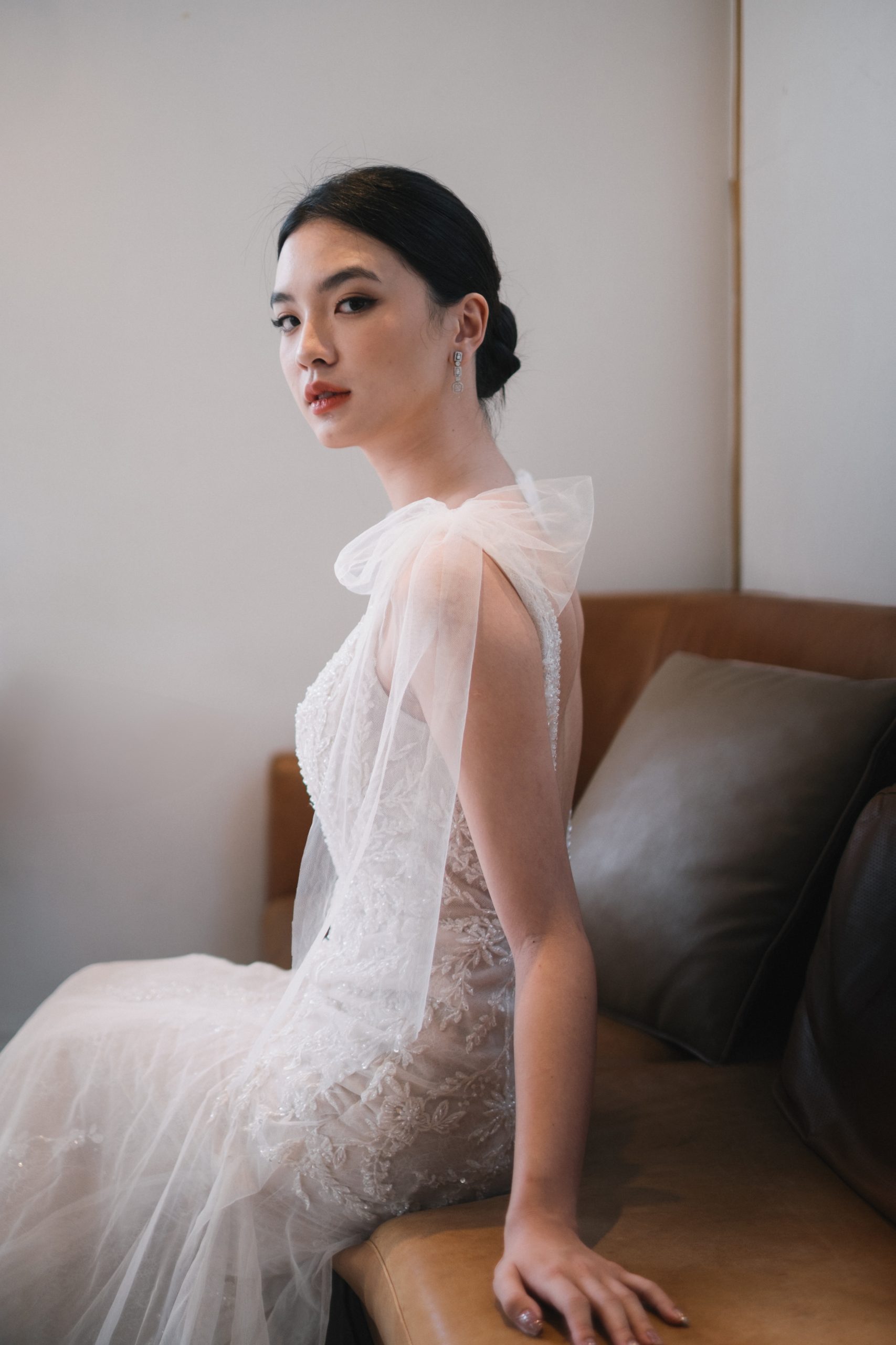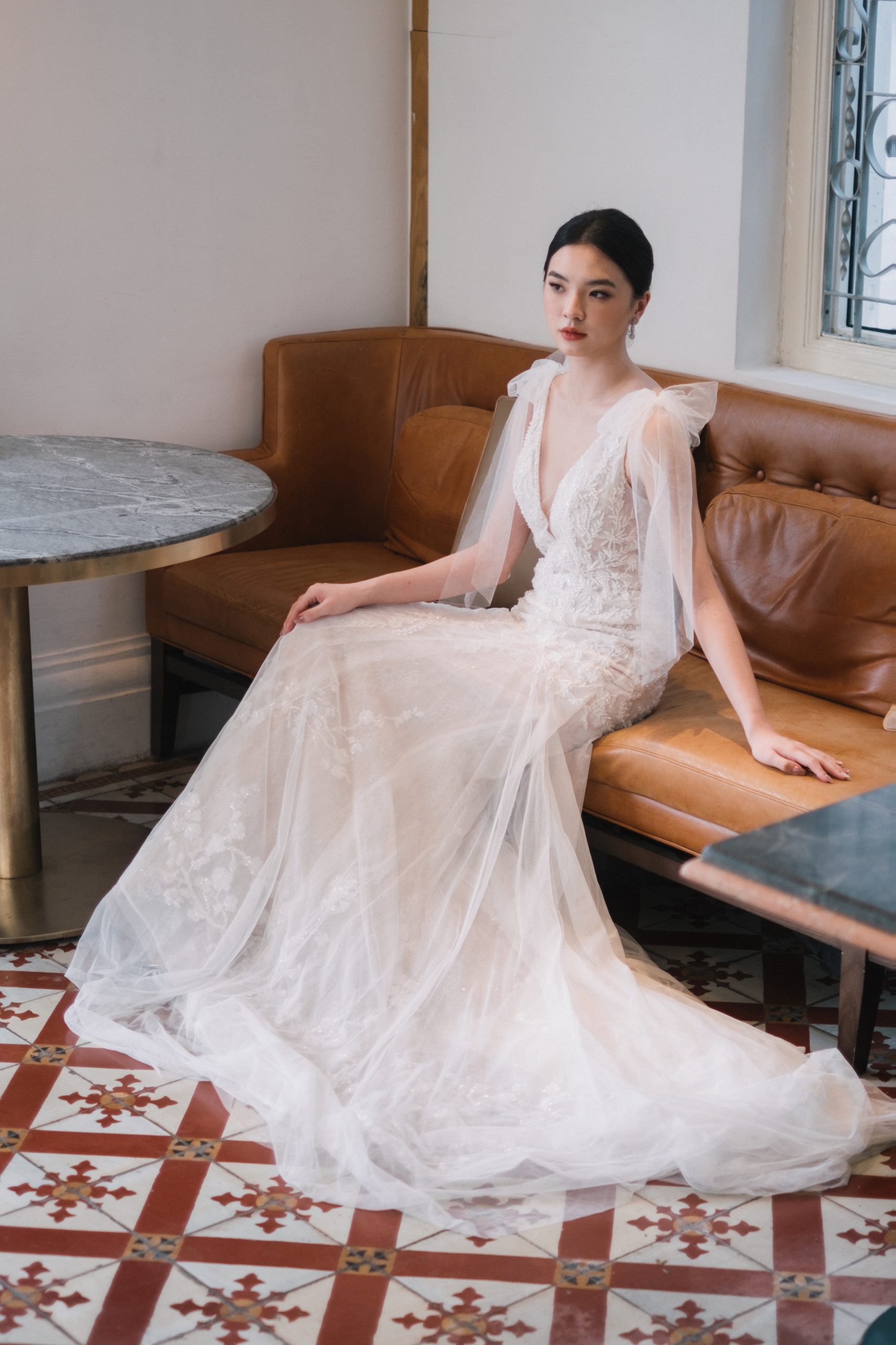 A graceful mermaid gown that blends femininity with modern detail. Crafted in delicate lace and soft tulle, Audrey features a flattering V-neckline, elegant open back, and airy tulle ribbon shoulder ties that flutter with every step. The figure hugging silhouette celebrates the bride’s natural curves, while its refined details exude charm and romance-making it a perfect choice for an unforgettable wedding day.