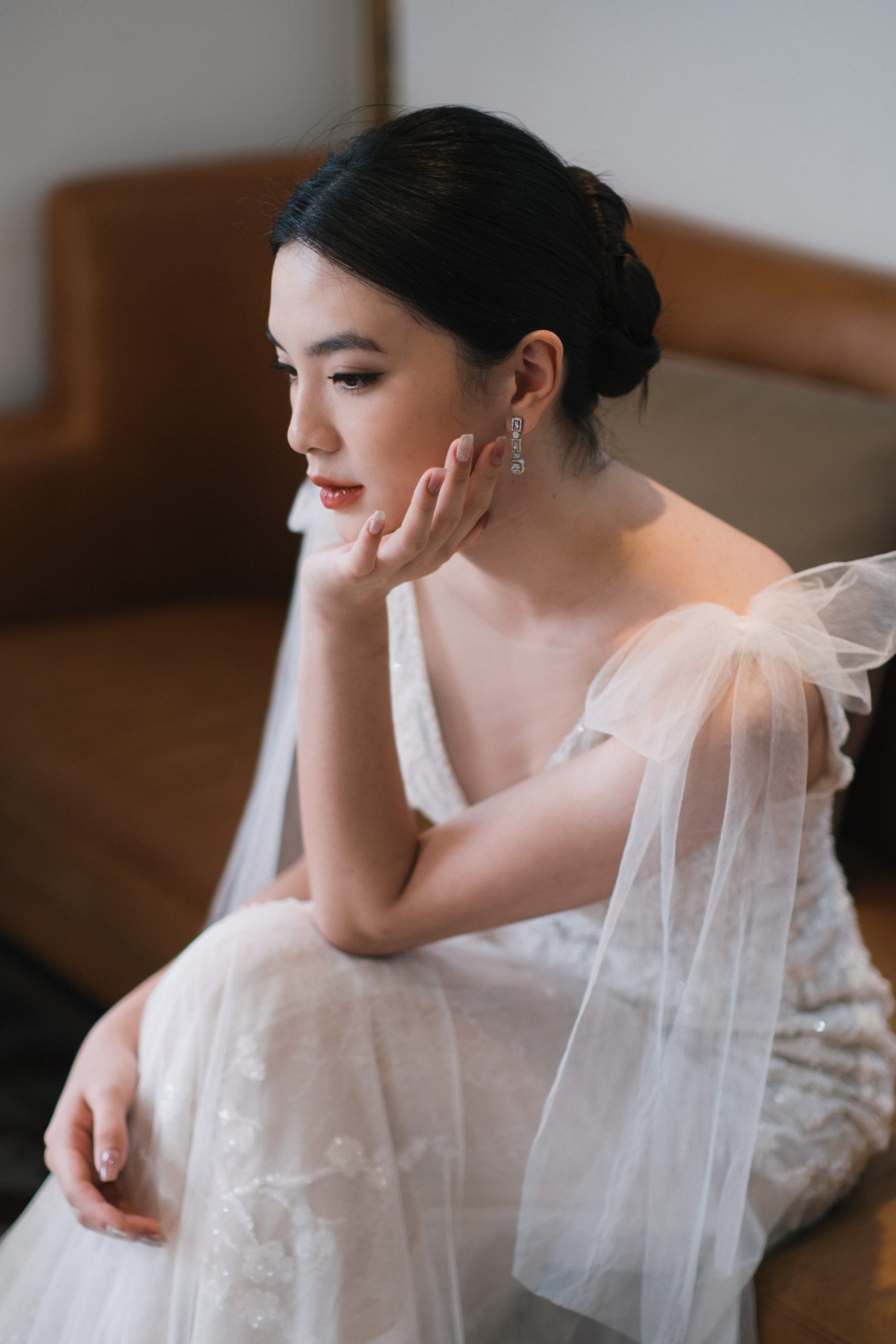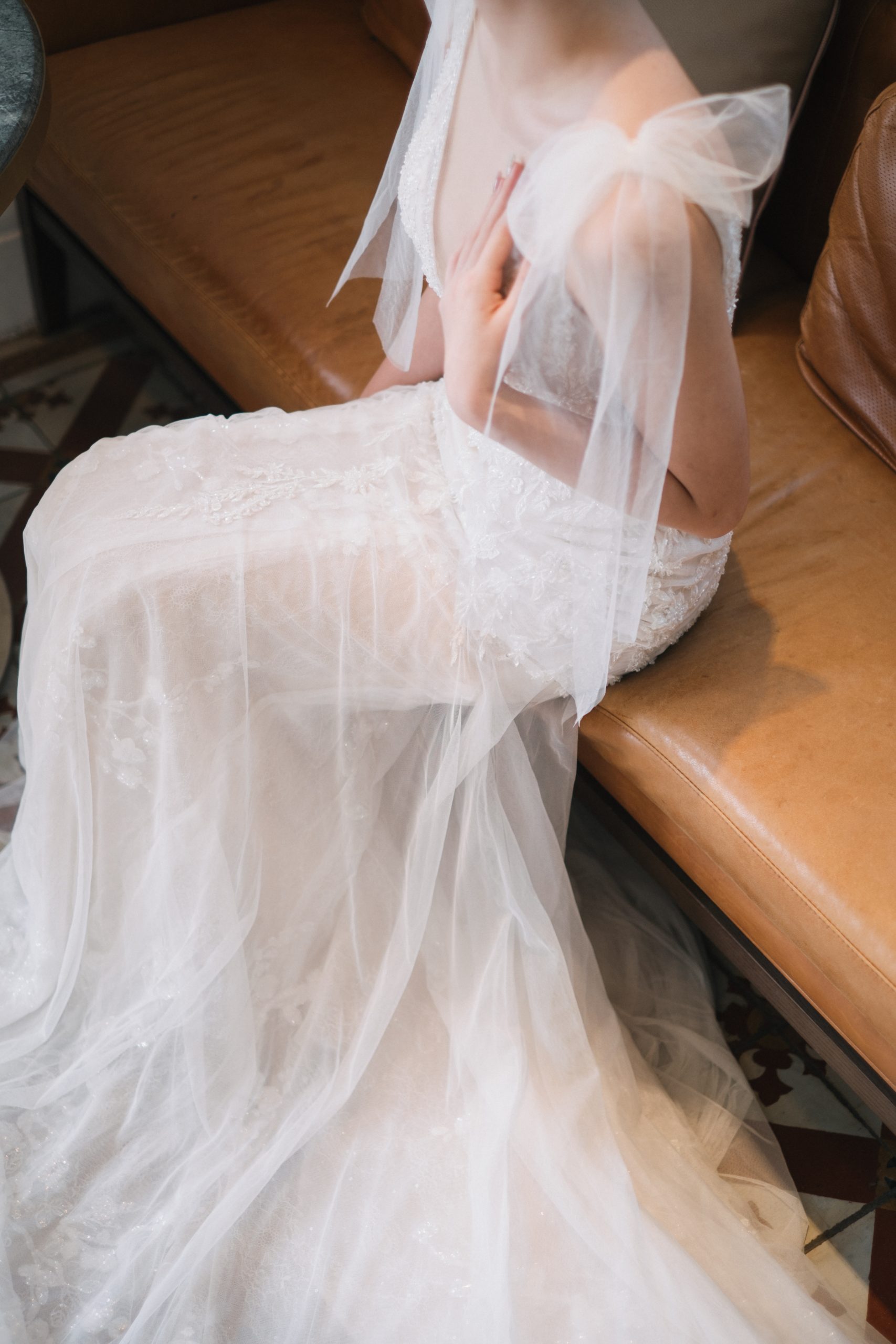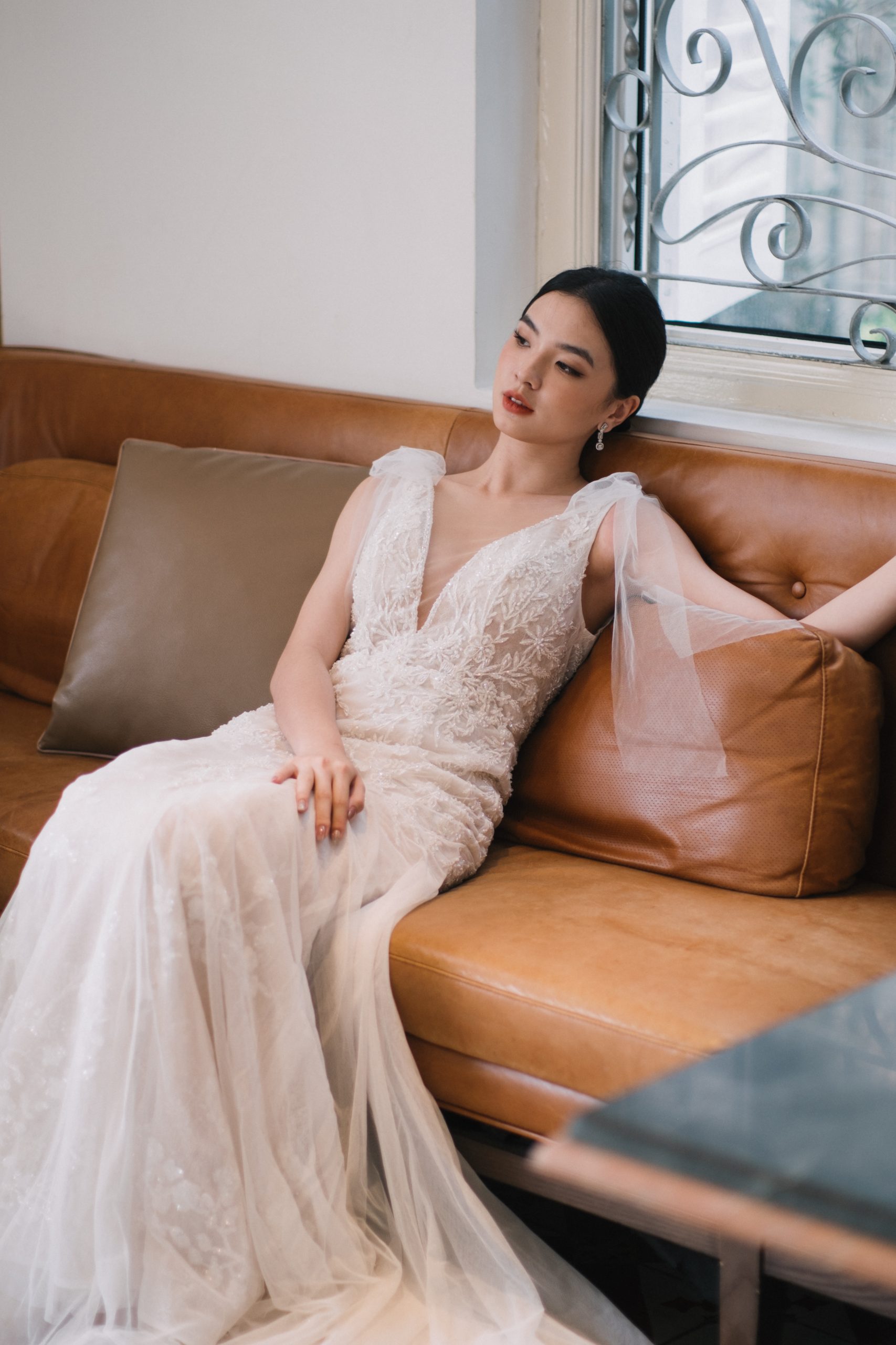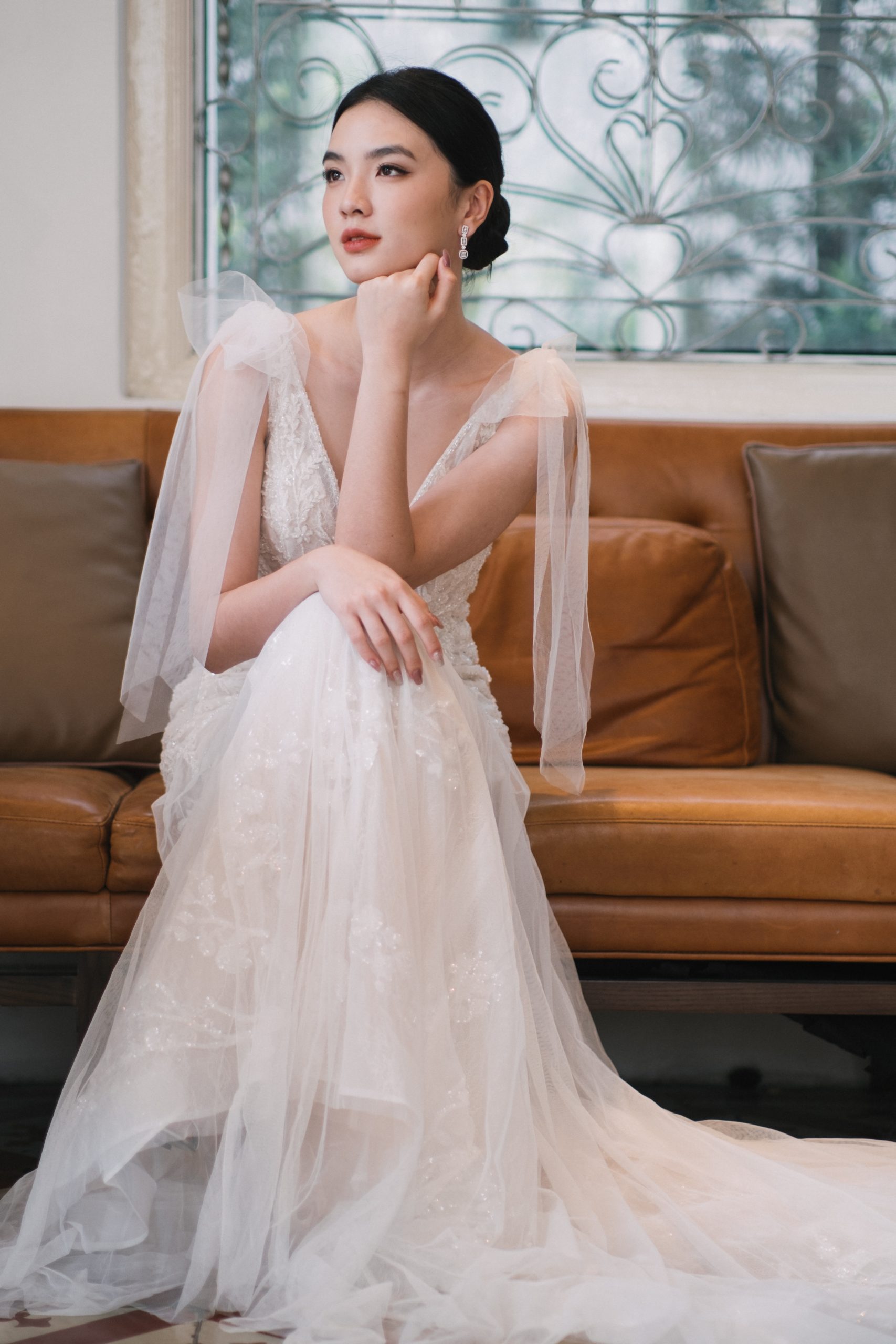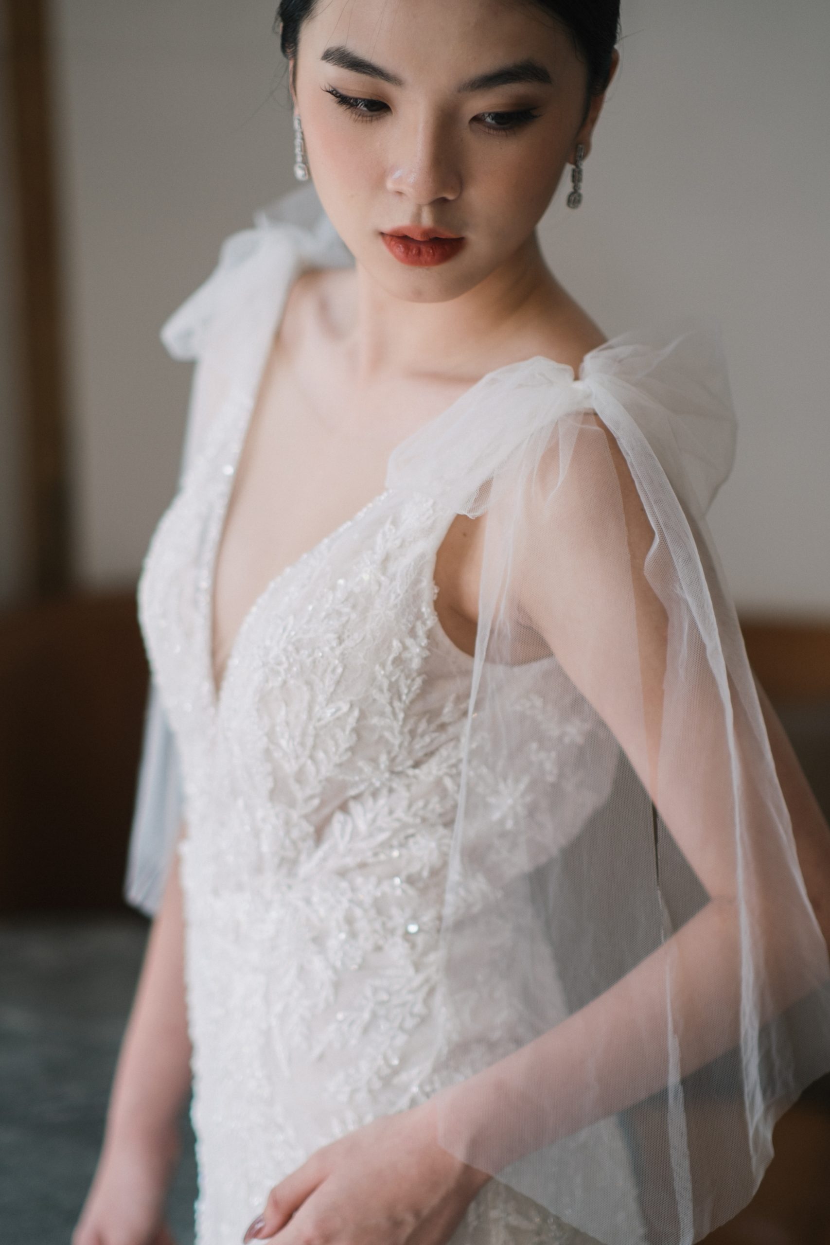 A graceful mermaid gown that blends femininity with modern detail. Crafted in delicate lace and soft tulle, Audrey features a flattering V-neckline, elegant open back, and airy tulle ribbon shoulder ties that flutter with every step. The figure hugging silhouette celebrates the bride’s natural curves, while its refined details exude charm and romance-making it a perfect choice for an unforgettable wedding day.