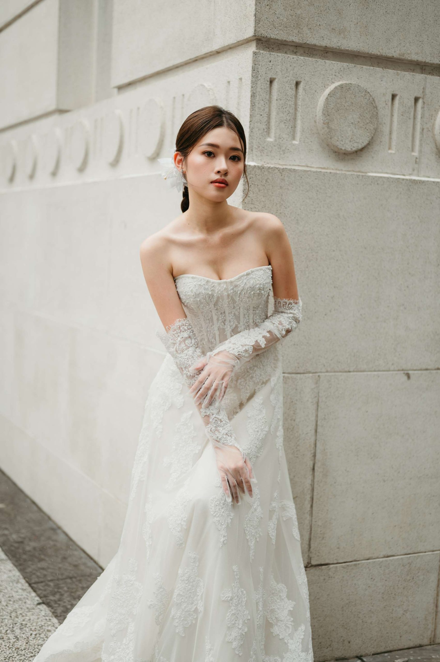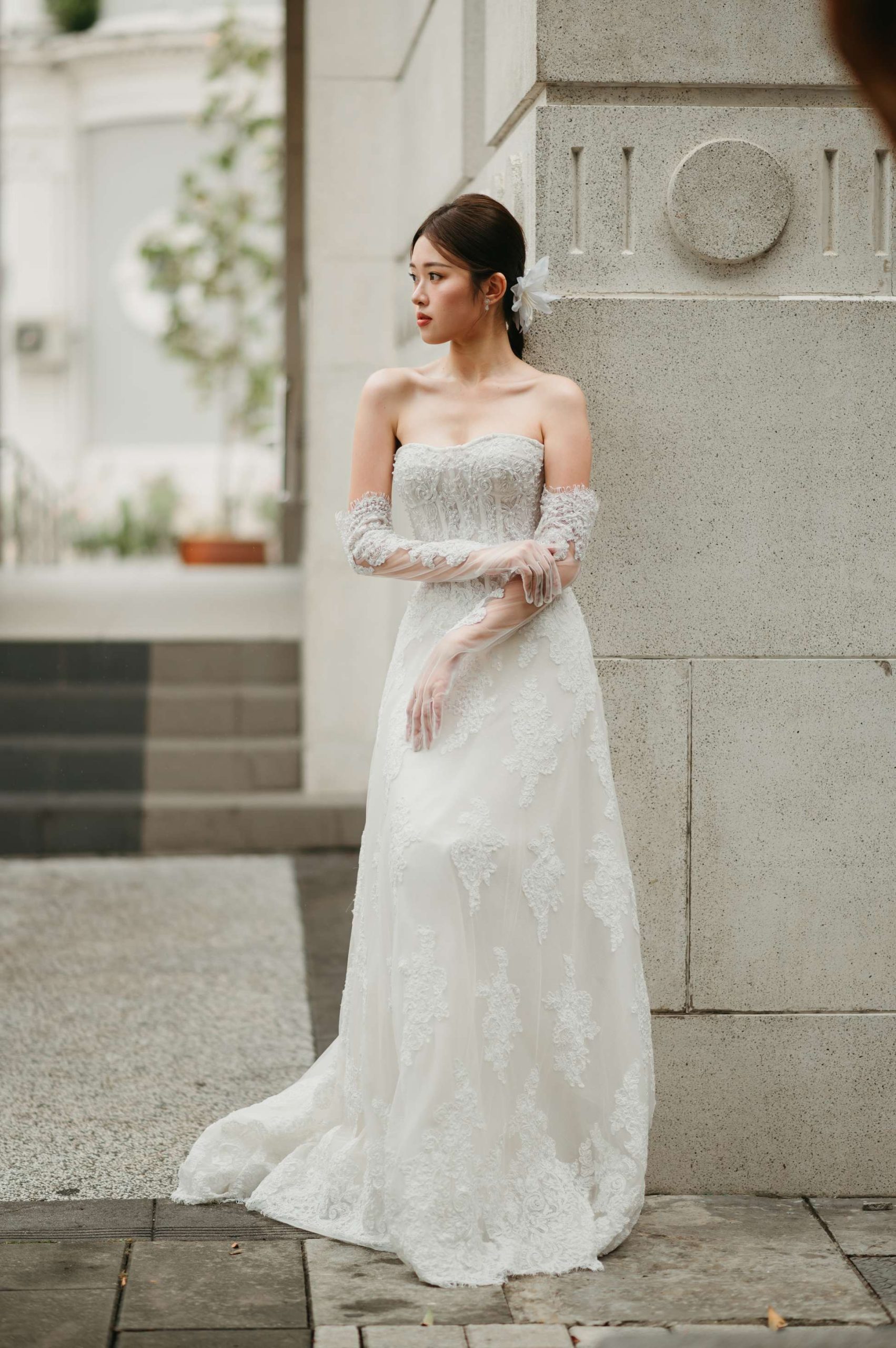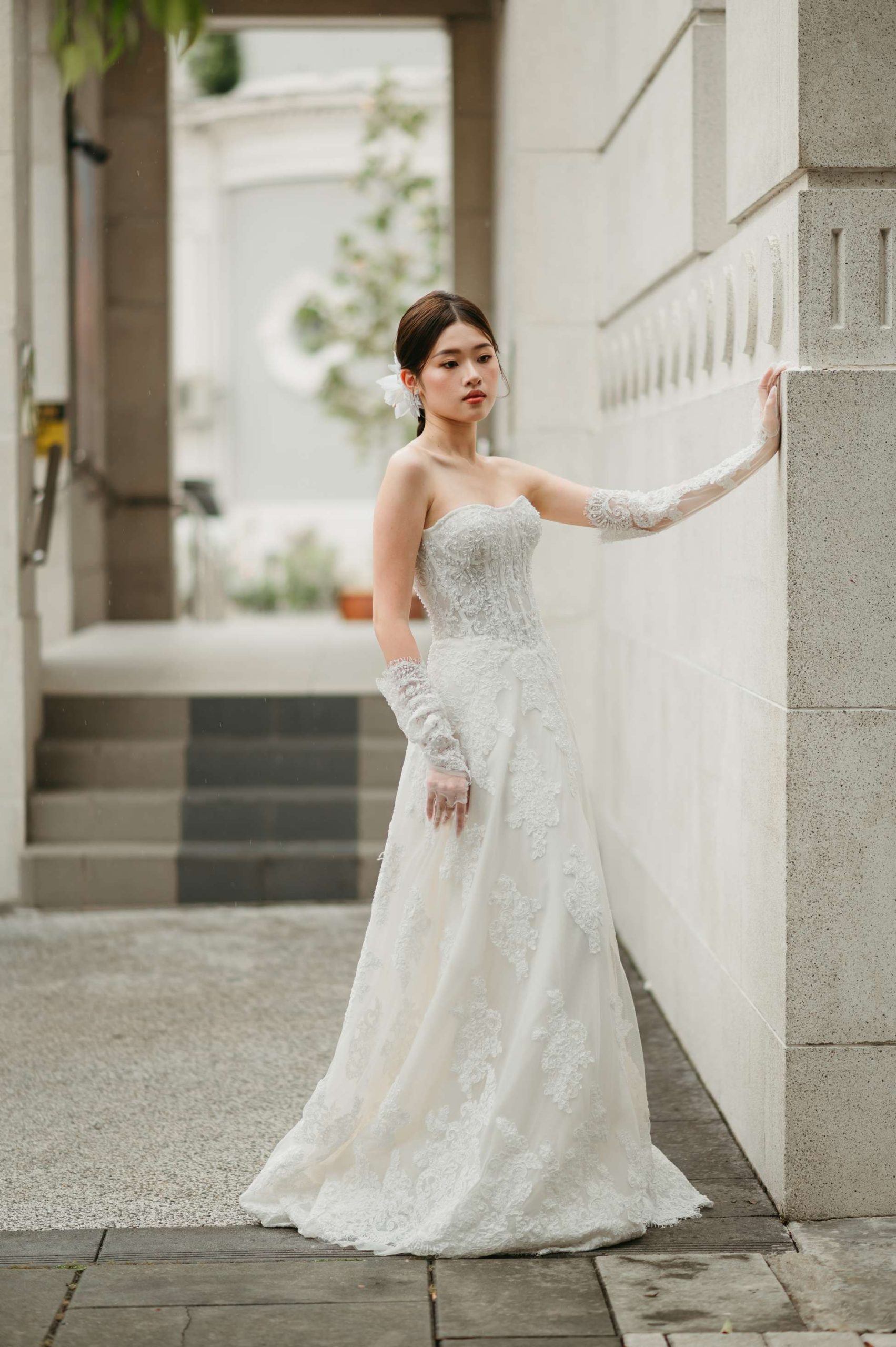 Delicate and timeless, Hedy is an A-line lace gown that effortlessly balances grace and softness. Featuring a strapless sweetheart neckline and intricately placed lace appliqués throughout, the gown highlights the bride’s natural elegance without overpowering her silhouette. The flowing skirt creates a soft, ethereal movement, while the matching long lace gloves add a touch of vintage refinement. A perfect choice for brides who desire a light, romantic look for their wedding day.