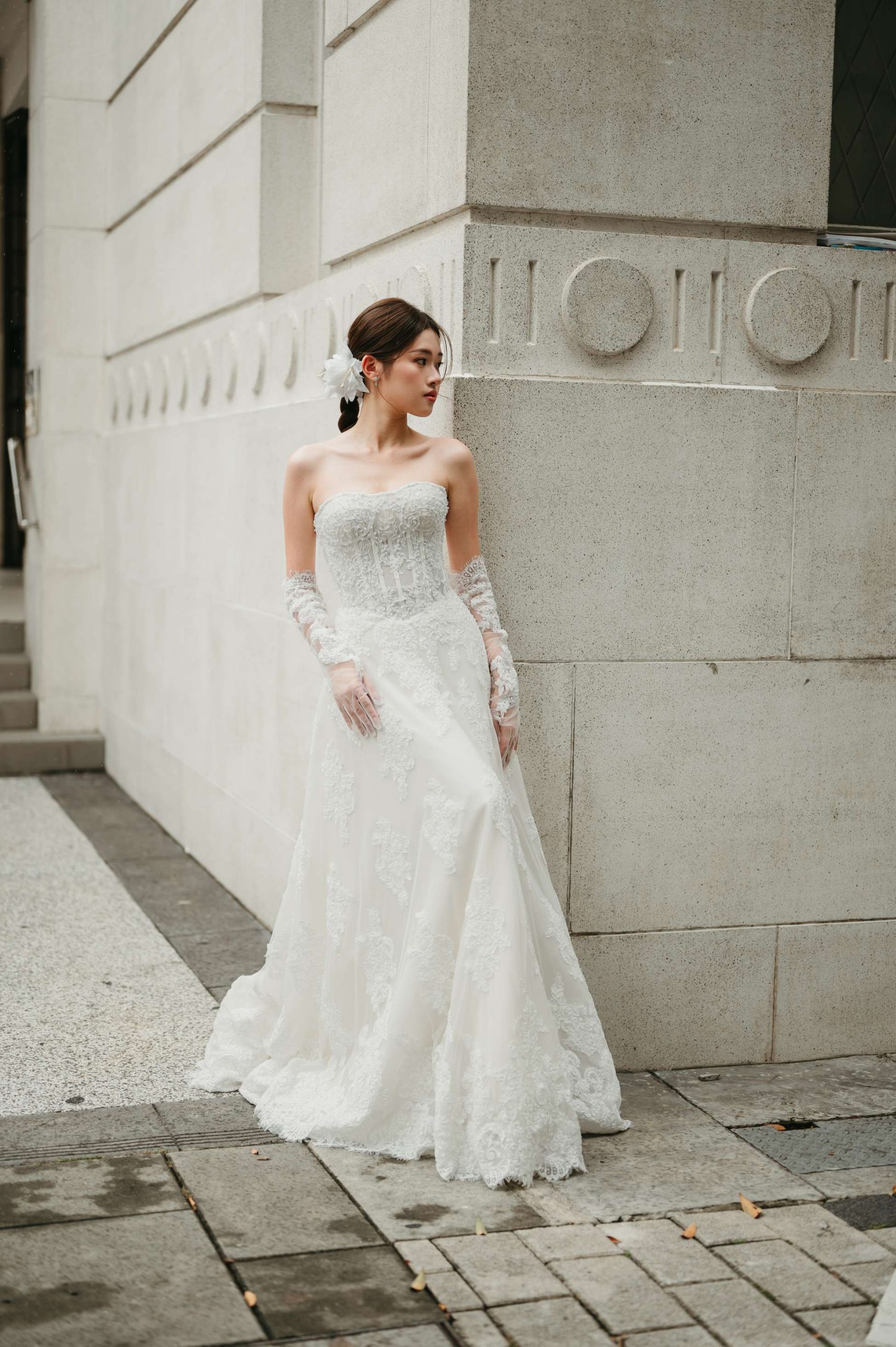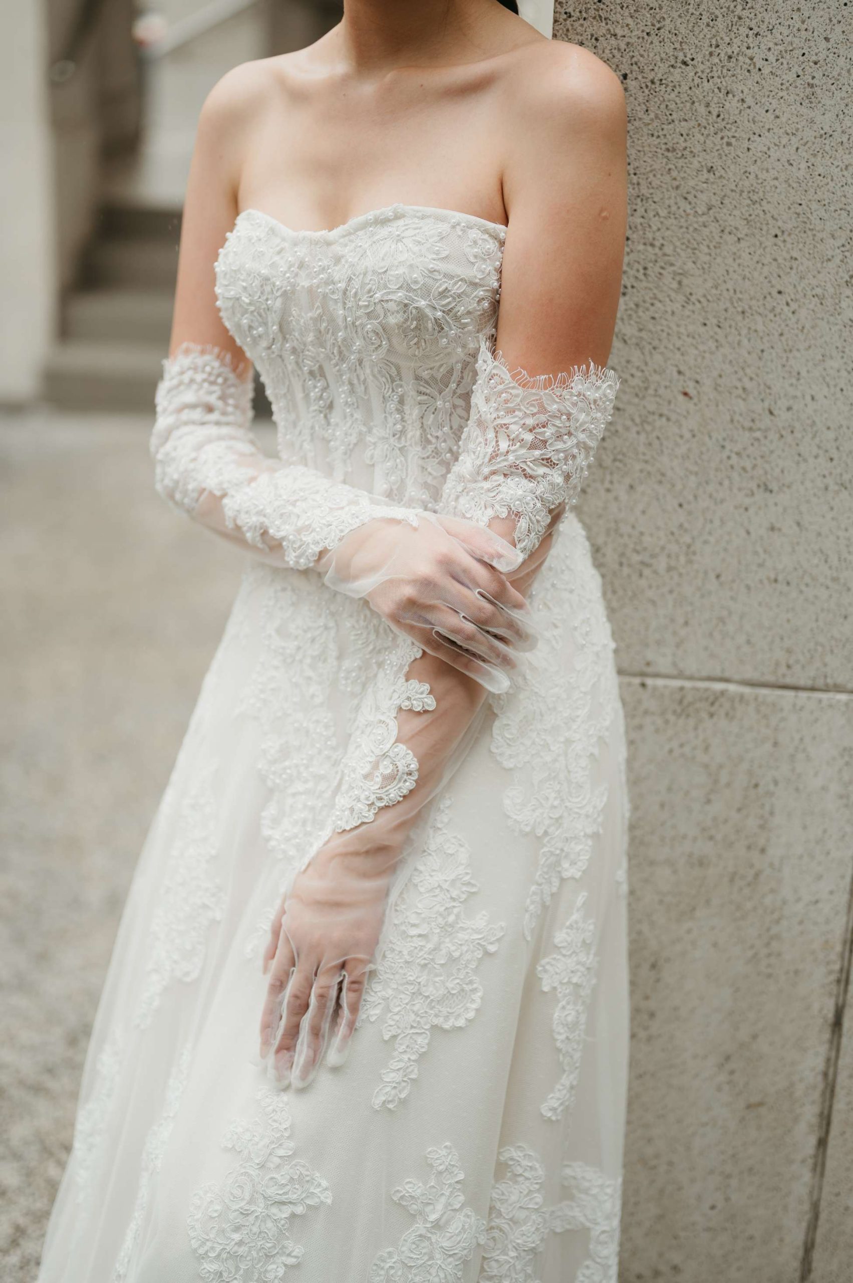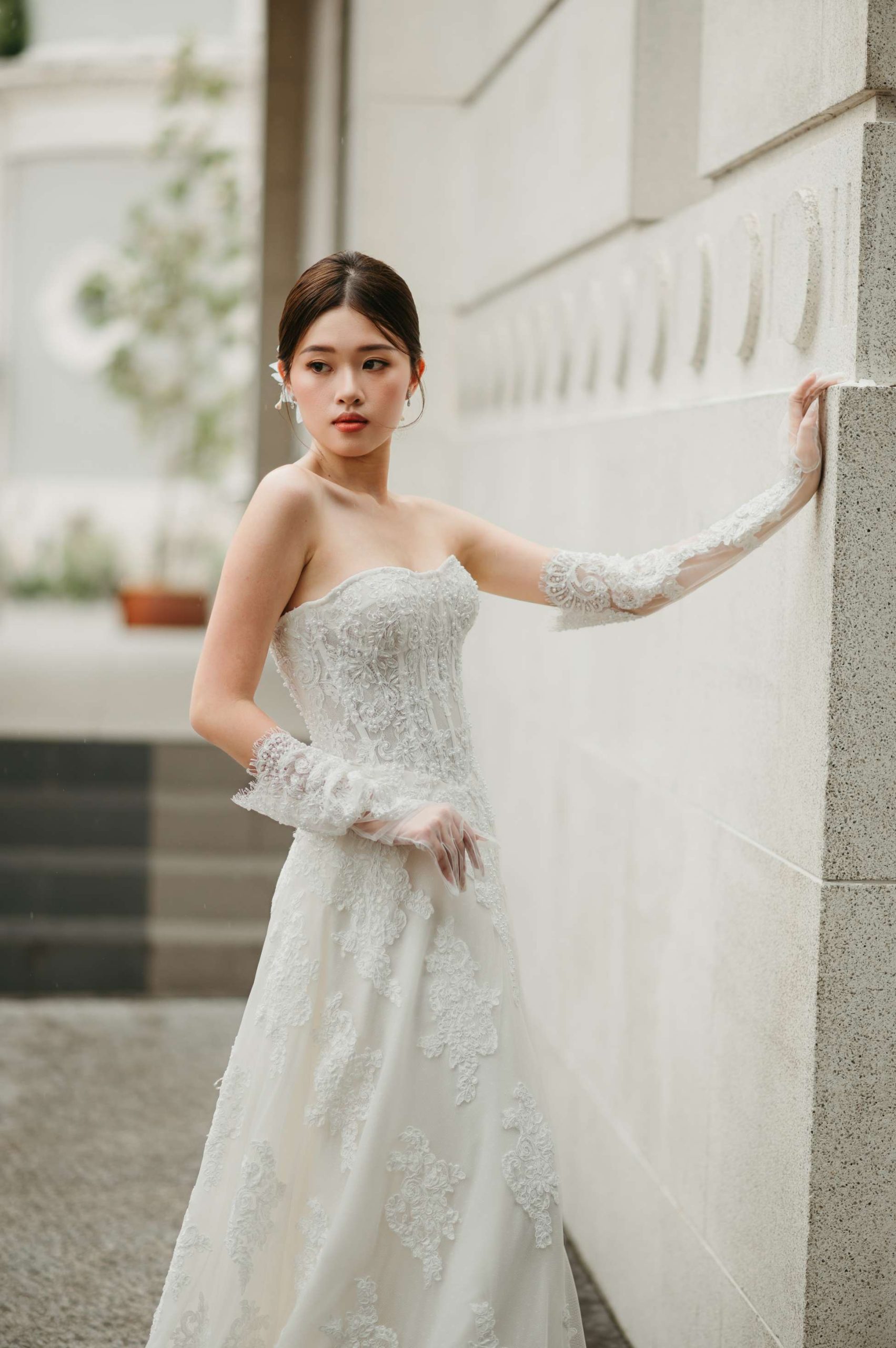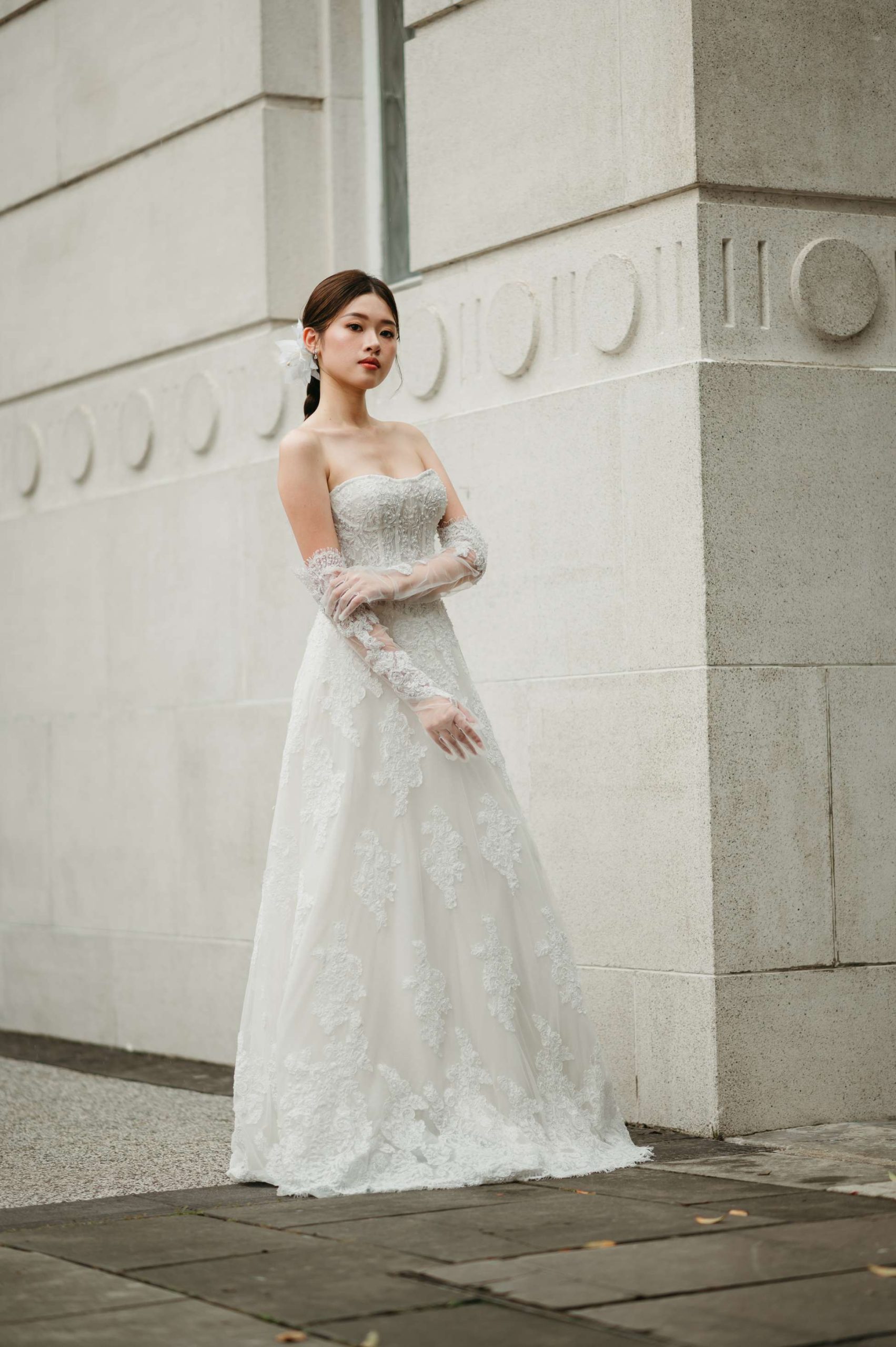 Delicate and timeless, Hedy is an A-line lace gown that effortlessly balances grace and softness. Featuring a strapless sweetheart neckline and intricately placed lace appliqués throughout, the gown highlights the bride’s natural elegance without overpowering her silhouette. The flowing skirt creates a soft, ethereal movement, while the matching long lace gloves add a touch of vintage refinement. A perfect choice for brides who desire a light, romantic look for their wedding day.