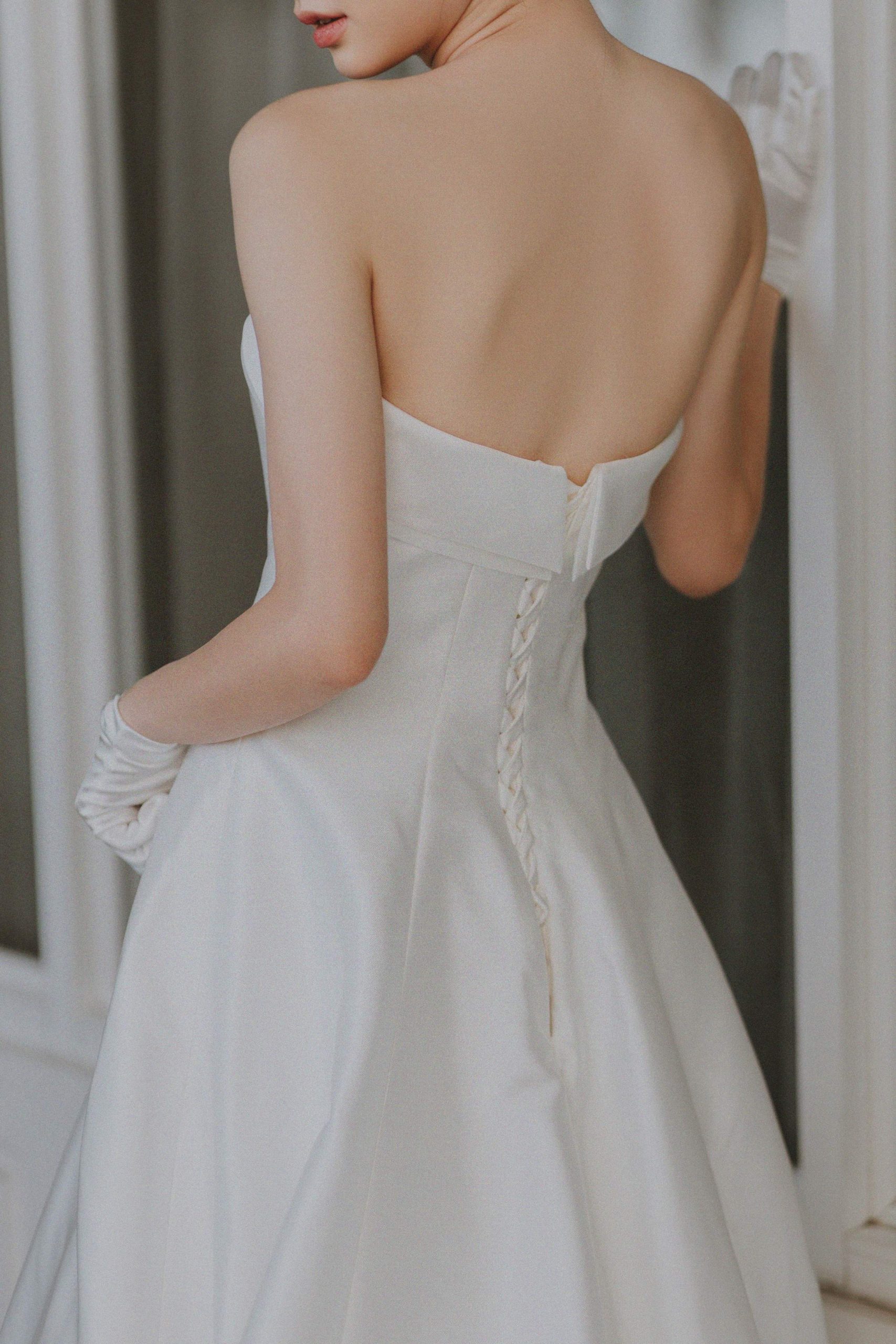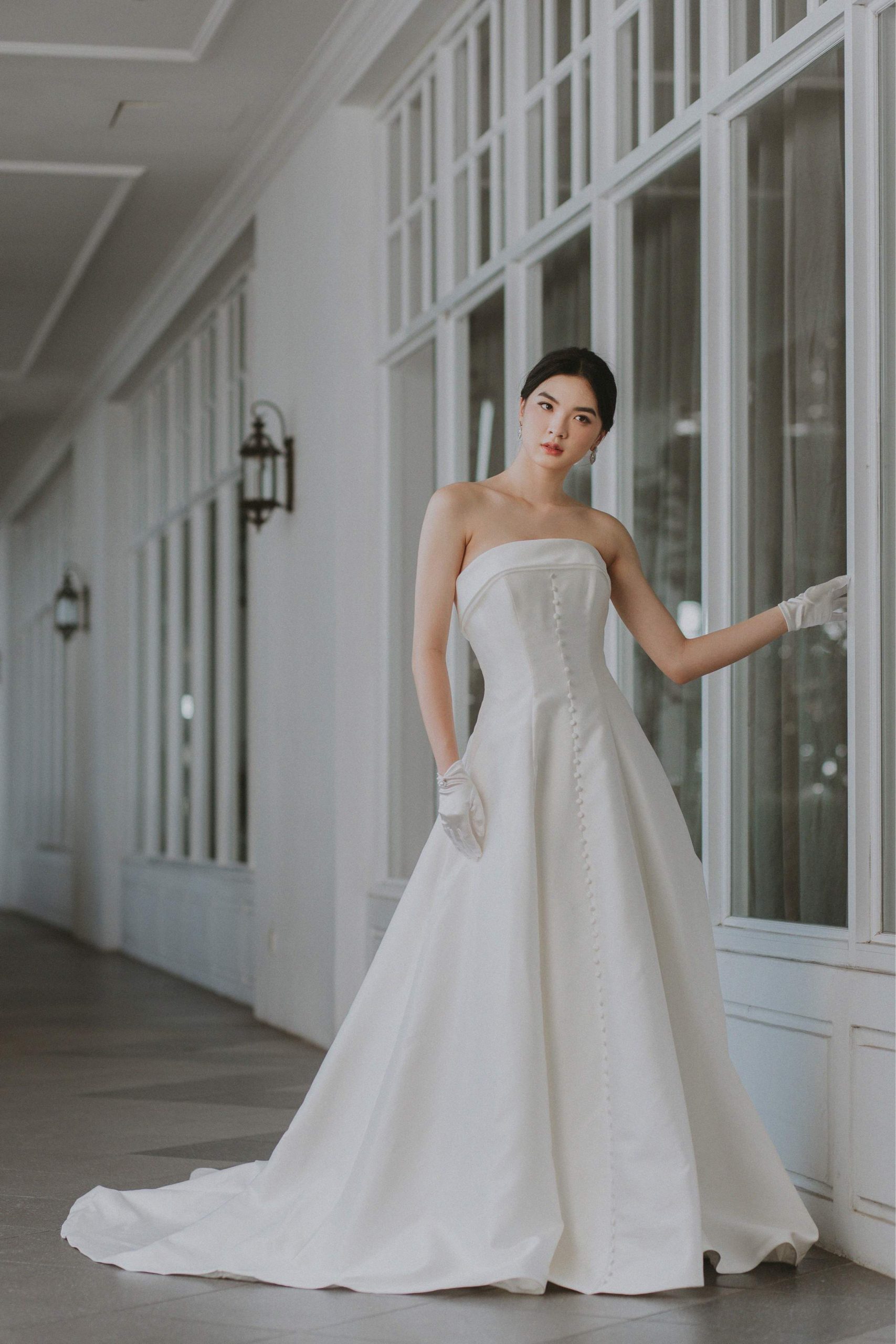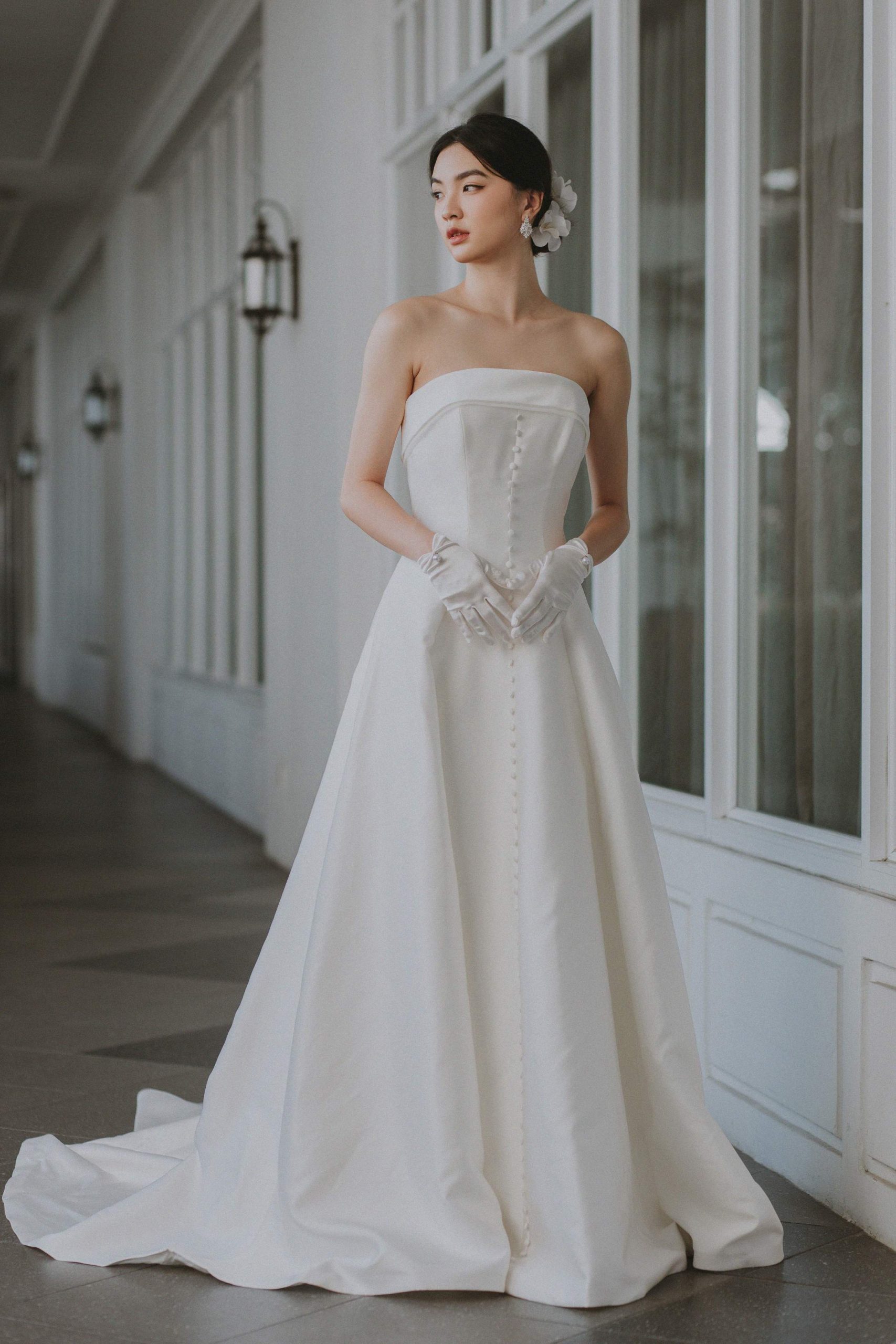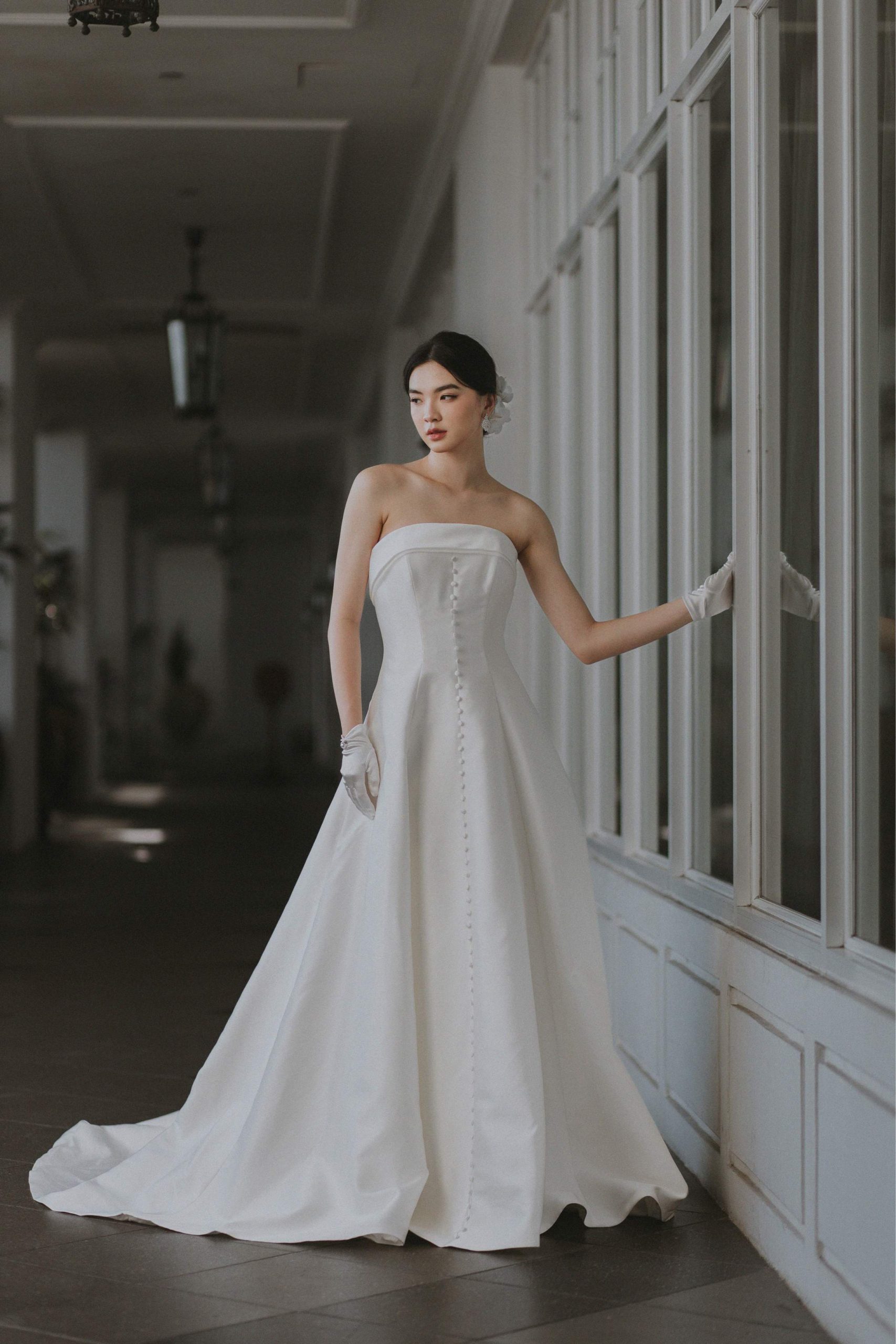 Timeless elegance meets modern simplicity in Lauren, a classic A-line gown crafted from smooth satin. The structured strapless bodice is beautifully enhanced by a row of covered buttons down the front, offering subtle detail with refined charm. Its clean lines and flattering silhouette create a graceful presence, making *Lauren* the perfect choice for brides seeking sophistication and ease in every movement.