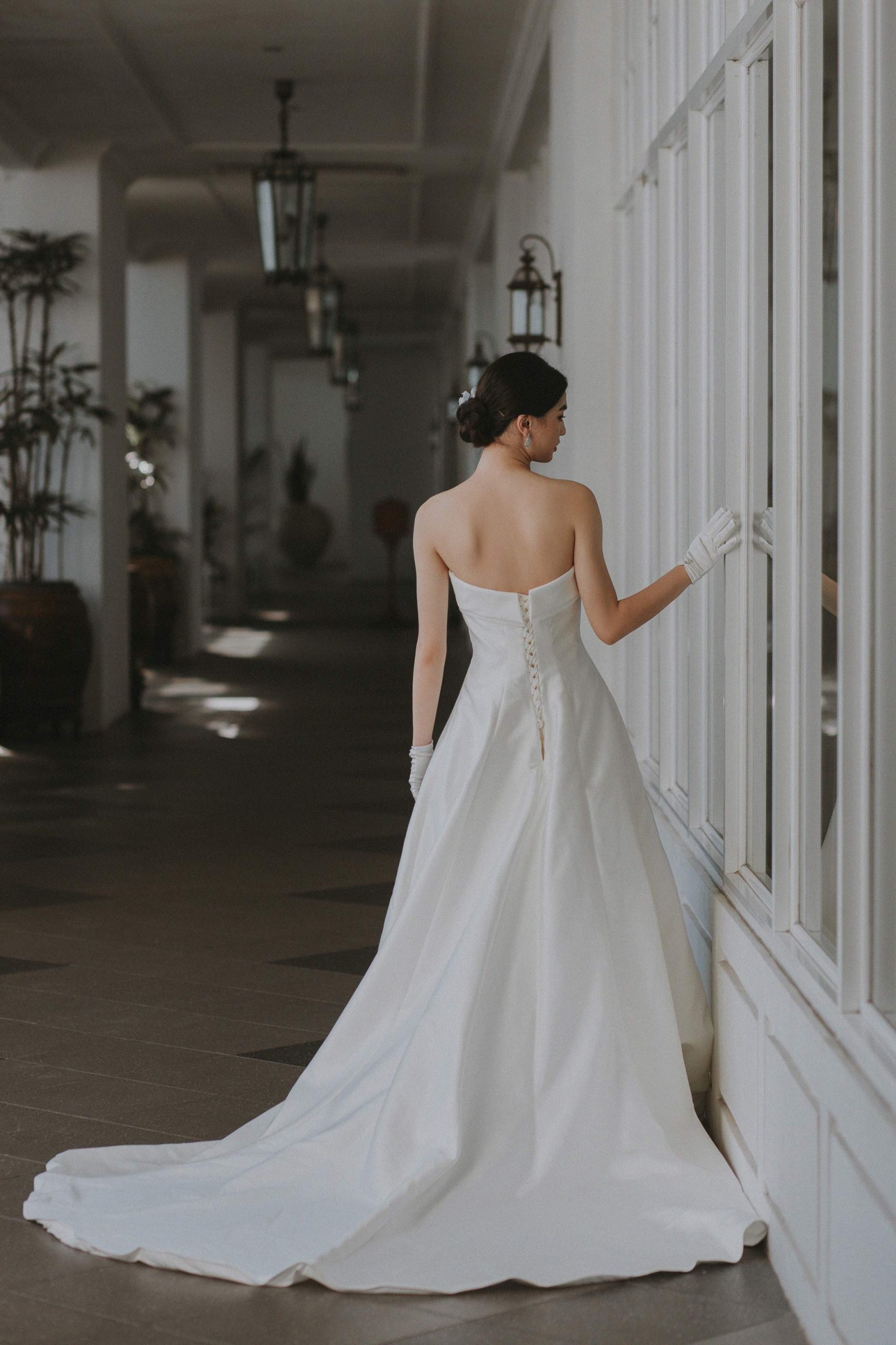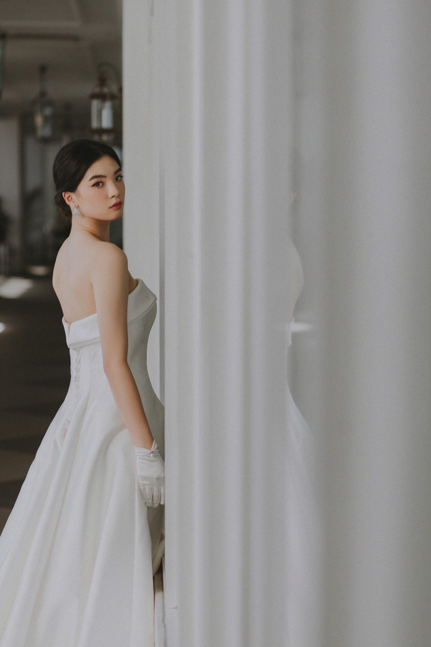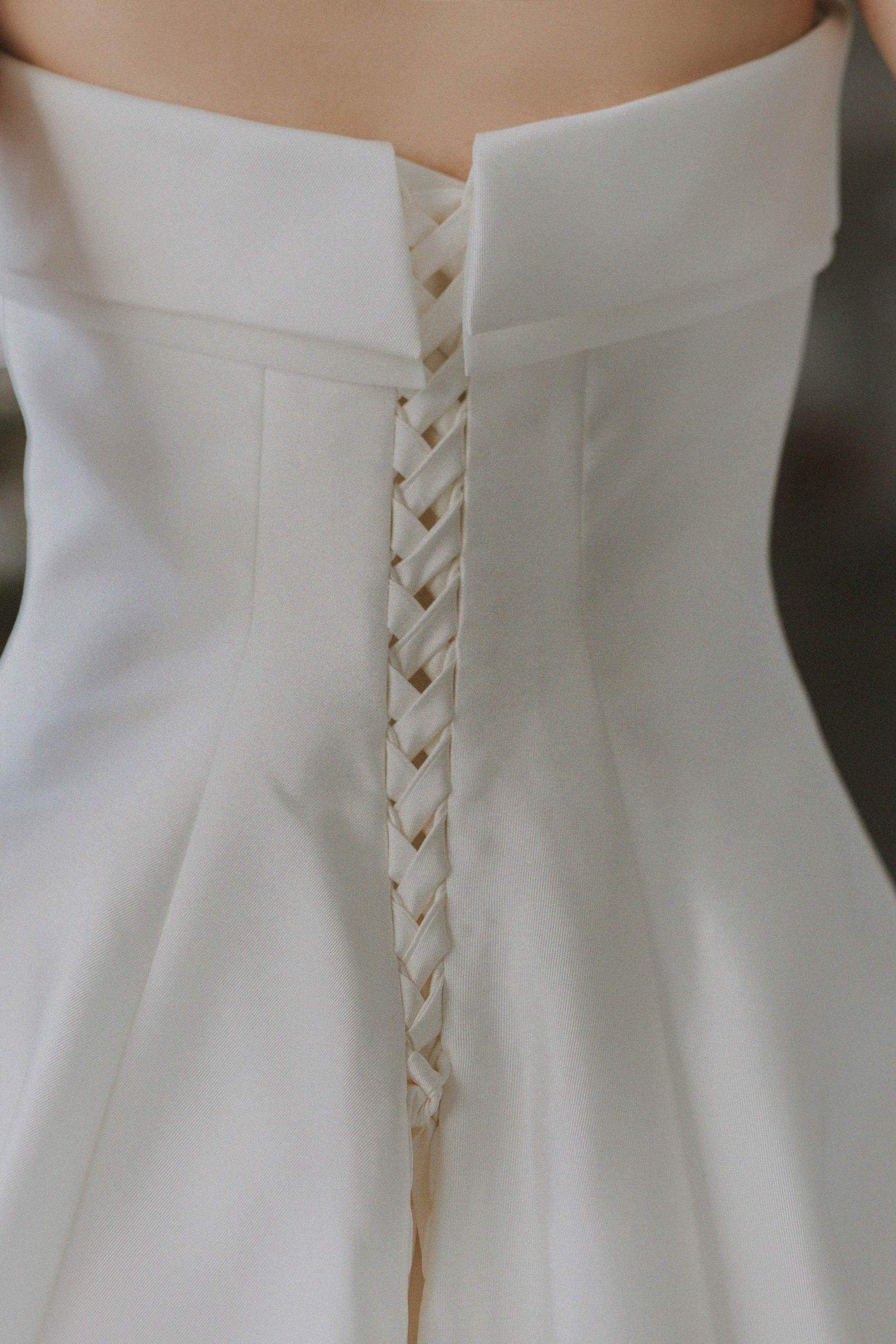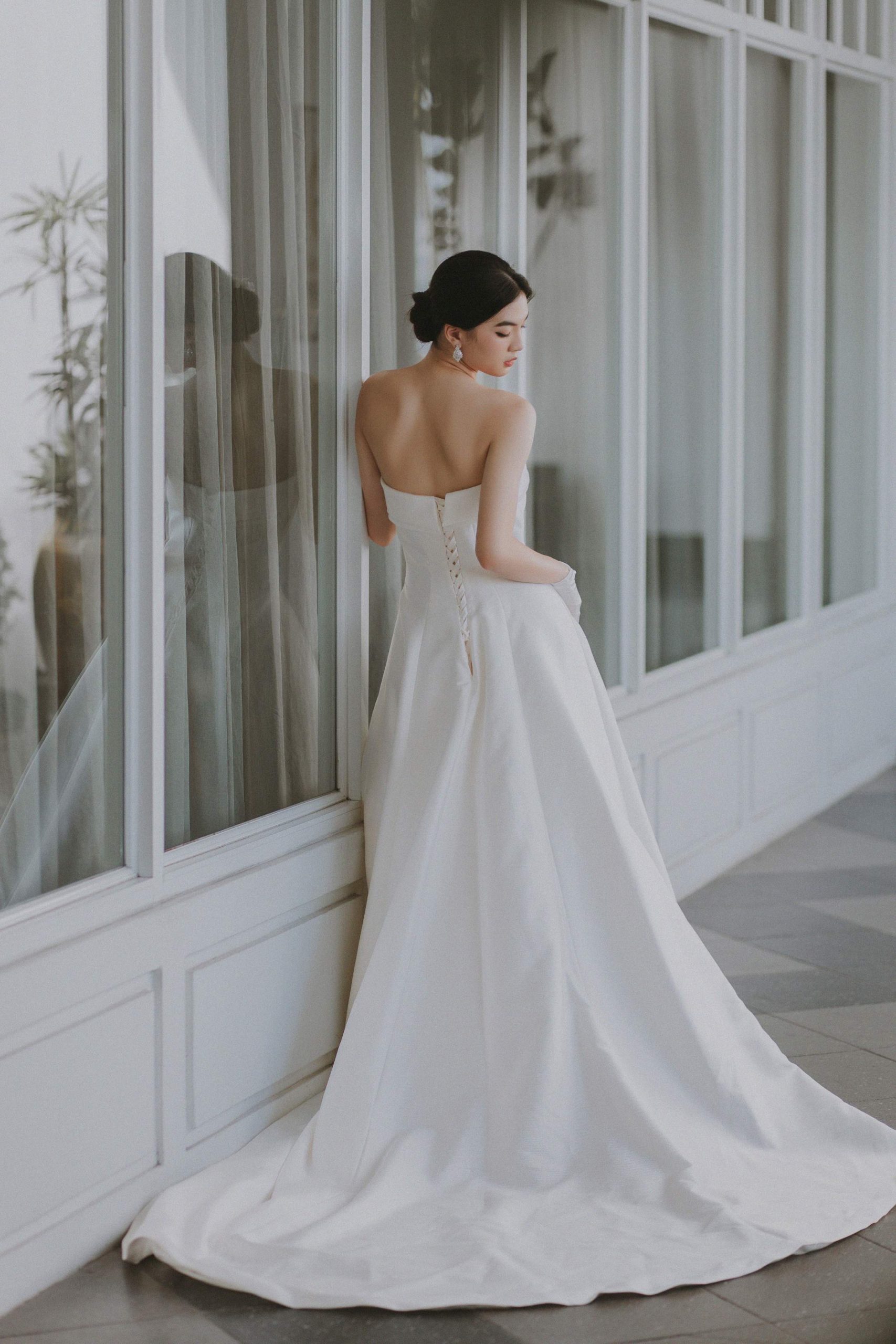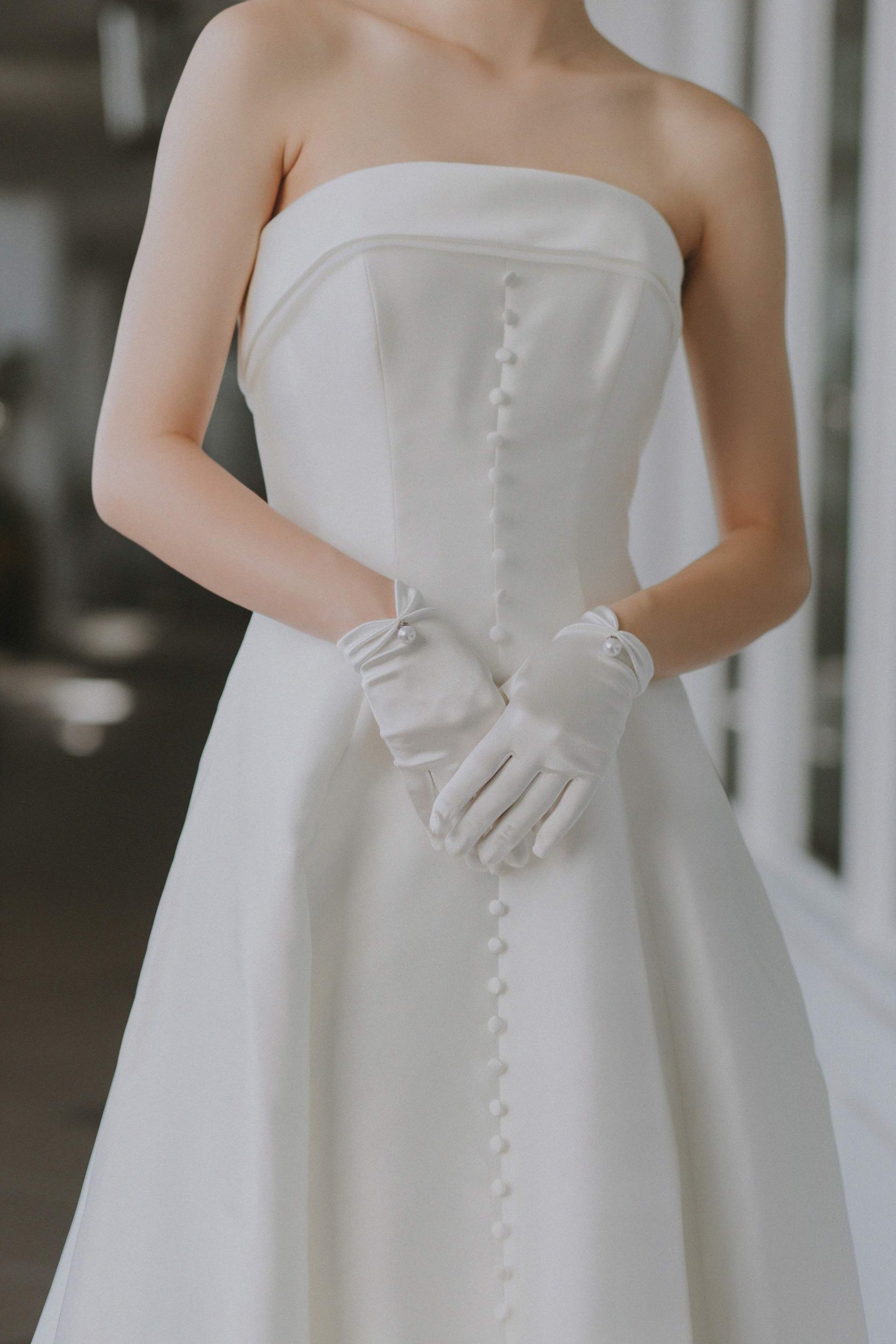 Timeless elegance meets modern simplicity in Lauren, a classic A-line gown crafted from smooth satin. The structured strapless bodice is beautifully enhanced by a row of covered buttons down the front, offering subtle detail with refined charm. Its clean lines and flattering silhouette create a graceful presence, making *Lauren* the perfect choice for brides seeking sophistication and ease in every movement.